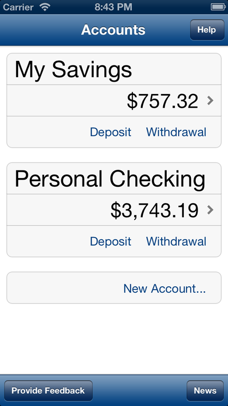 Provide Feedback or View the NewsThe bottom toolbar on the Accounts screen allows you quick access to let us know what you do and don't like about the app. You can also let us know what additional tools would help you to better manage your money.